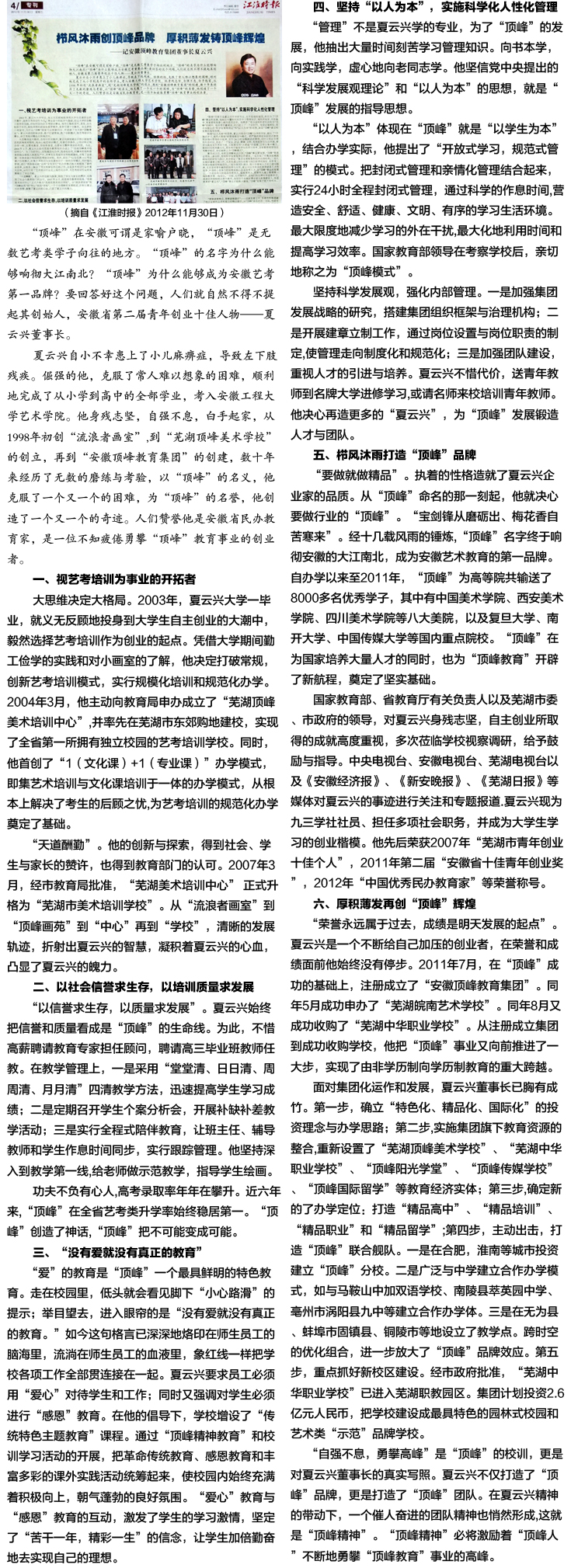 櫛風(fēng)沐雨創(chuàng)頂峰品牌 厚積薄發(fā)鑄頂峰輝煌《江淮時(shí)報(bào)》