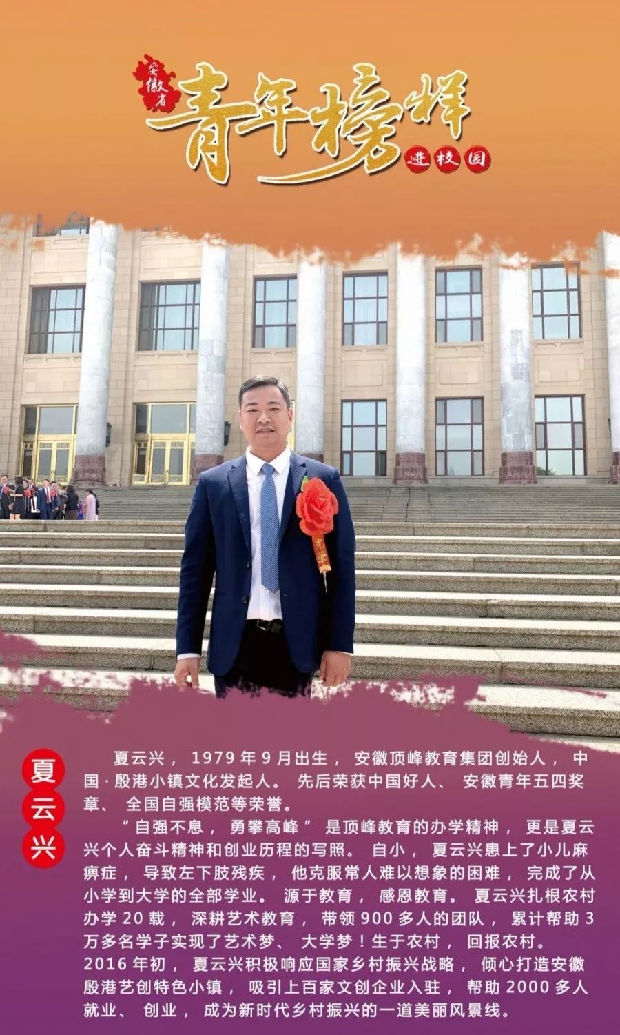 中國好人、安徽五四青年獎?wù)、全國自?qiáng)模范夏云興作為青年榜樣受邀出席,他自小患病導(dǎo)致左下肢殘疾,克服常人難以想象的困難,完成了從小學(xué)到大學(xué)的全部學(xué)業(yè)。他扎根農(nóng)村辦學(xué)20載,深耕藝術(shù)教育,累計幫助3萬多名學(xué)子實現(xiàn)了藝術(shù)夢、大學(xué)夢。他積極響應(yīng)國家鄉(xiāng)村振興戰(zhàn)略,傾心打造安徽殷港藝創(chuàng)特色小鎮(zhèn),吸引上百家文創(chuàng)企業(yè)入駐,幫助2000多人就業(yè)、創(chuàng)業(yè)!他的精神也鼓舞著全體頂峰人不斷“勇攀高峰”!夏校長與其他九組青年榜樣一起走進(jìn)安徽師范大學(xué),他們的故事鼓舞奮進(jìn),他們的精神值得所有人學(xué)習(xí)!