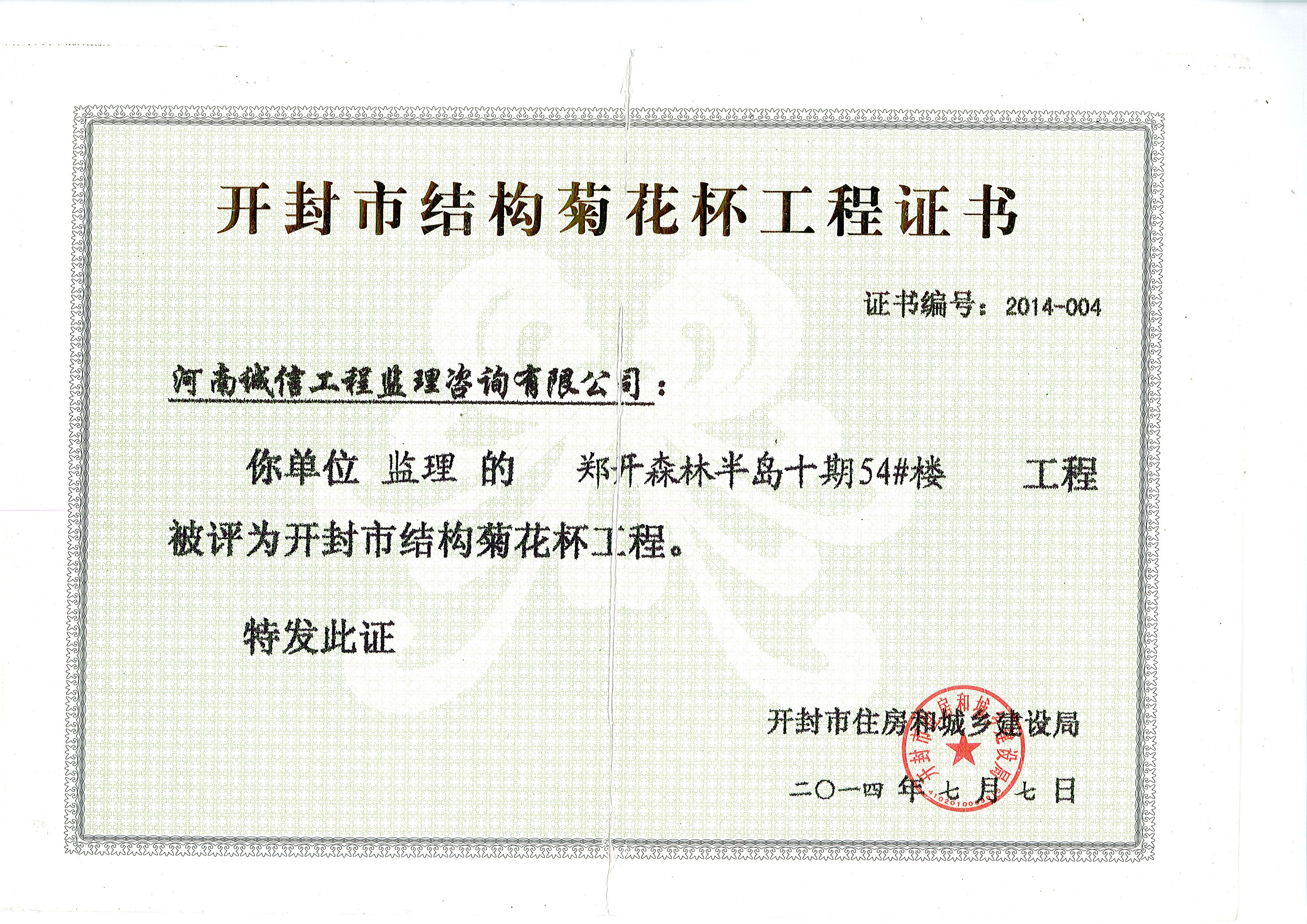 2015年開封中石油大廈工程被評為開封市機構菊花杯工程