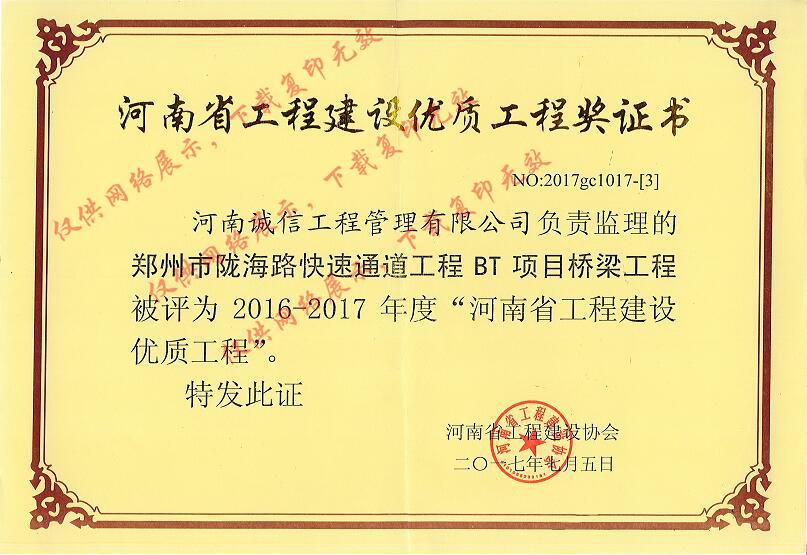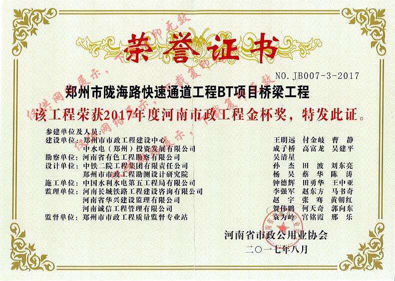 2016-2017年度河南省工程建設優(yōu)質工程鄭州市隴海路快速通道工程
