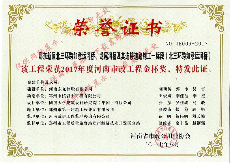 2017年度河南省市政工程金杯獎鄭東新區(qū)北三環(huán)跨如意運河橋