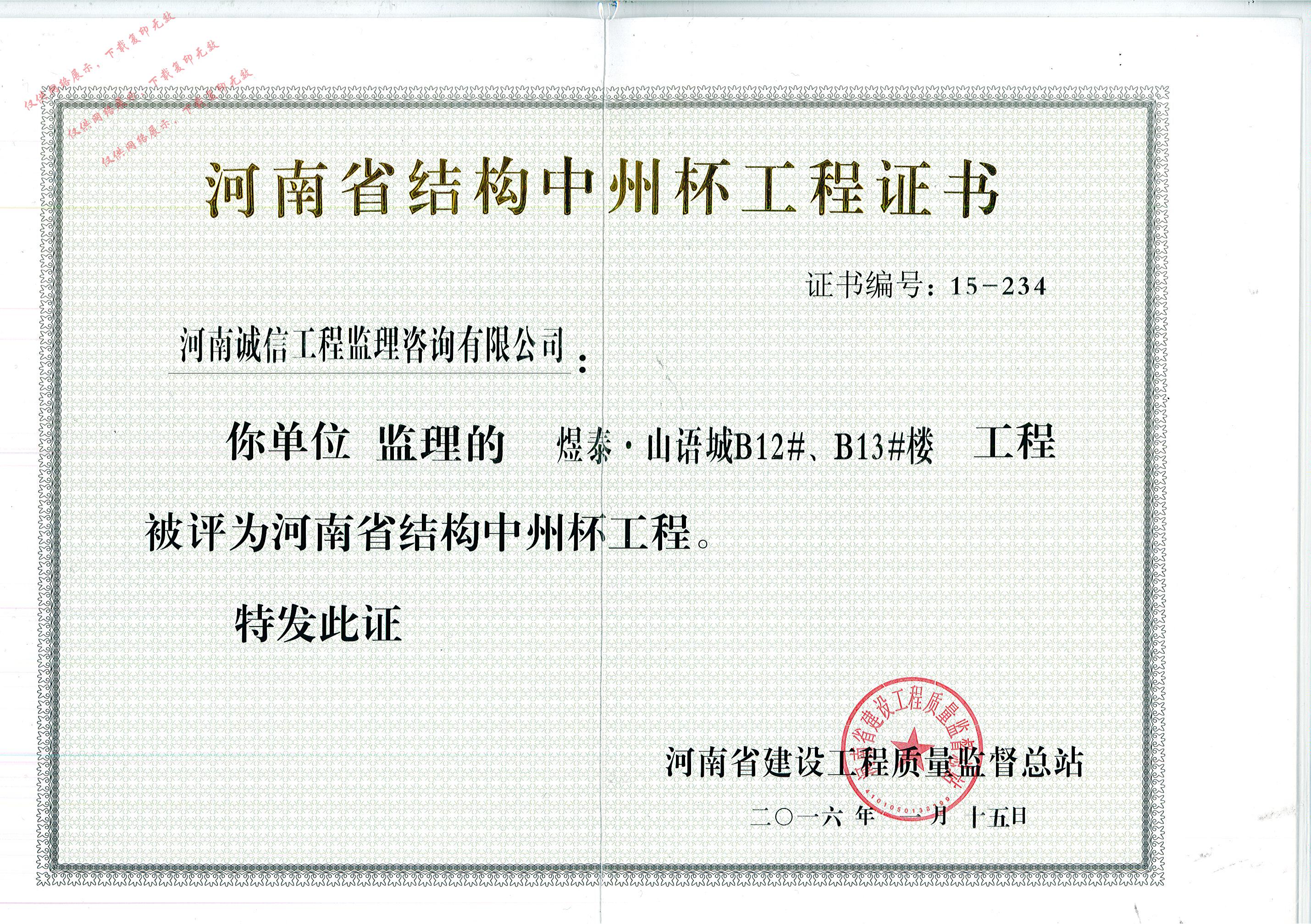 煜泰山禹城工程被評為“河南省結構中州杯”2016年