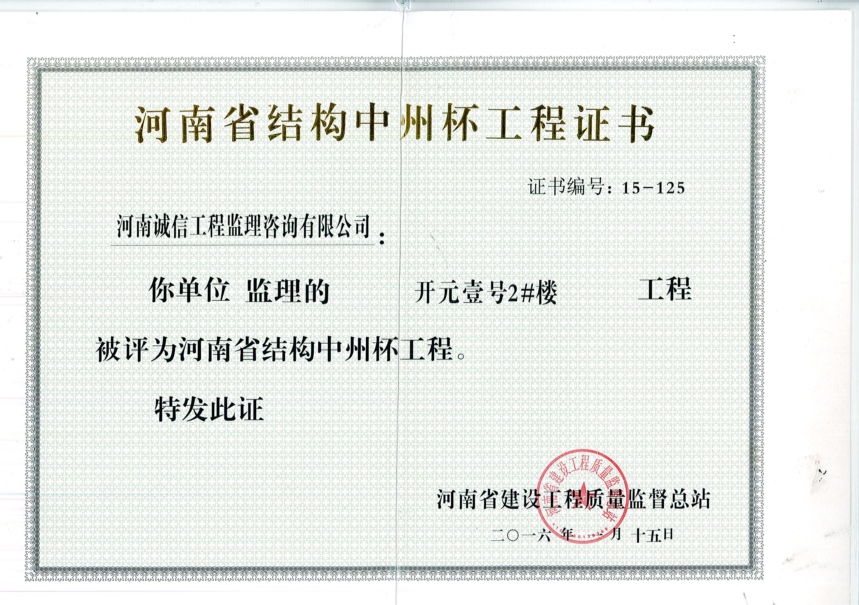 開元壹號工程被評為2016年“河南省結構中州杯”
