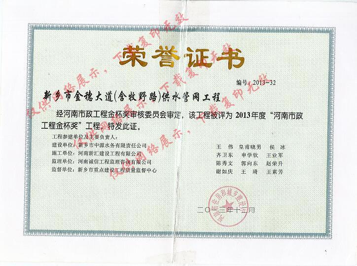 2013年度河南省市政工程金杯獎新鄉(xiāng)市金穗大道供水管網(wǎng)工程