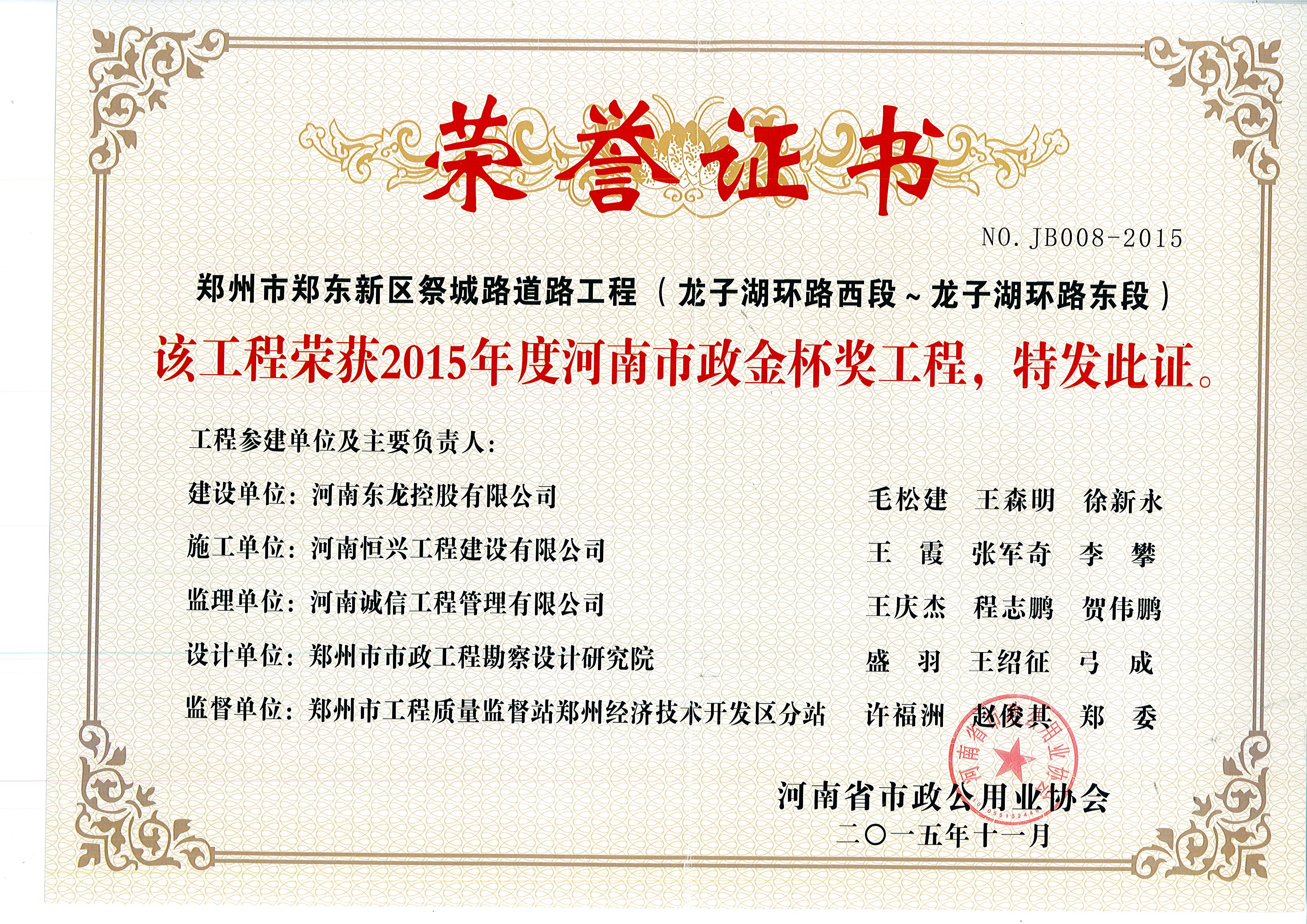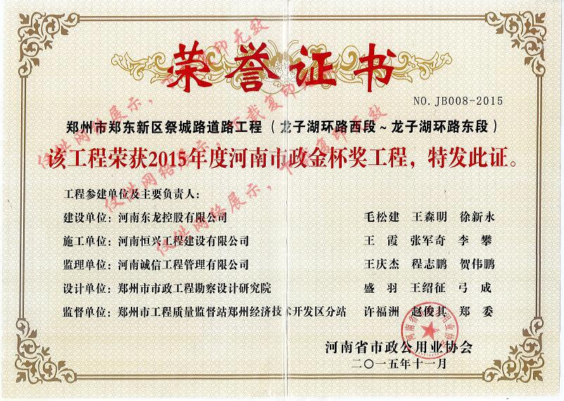 2015年鄭州市鄭東新區(qū)祭城路道路工程金杯獎