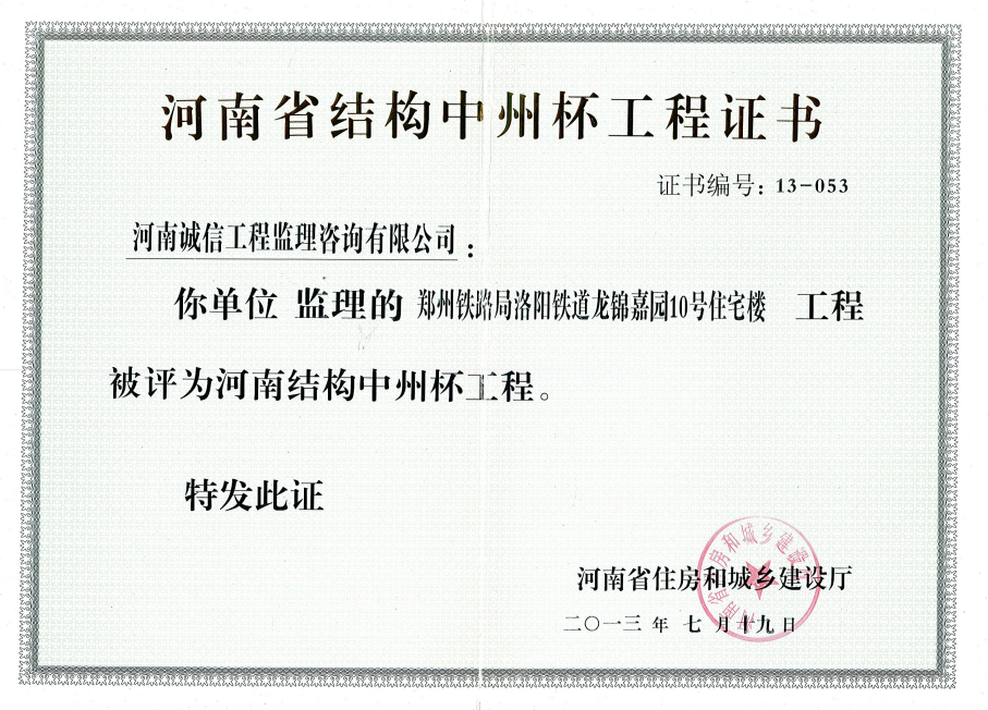 2013年鄭州鐵路局廬陽鐵道龍錦嘉園工程被評為河南省結構中州杯