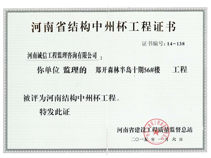 2015年鄭開森林半島工程被評為“河南省結構中州杯工程”