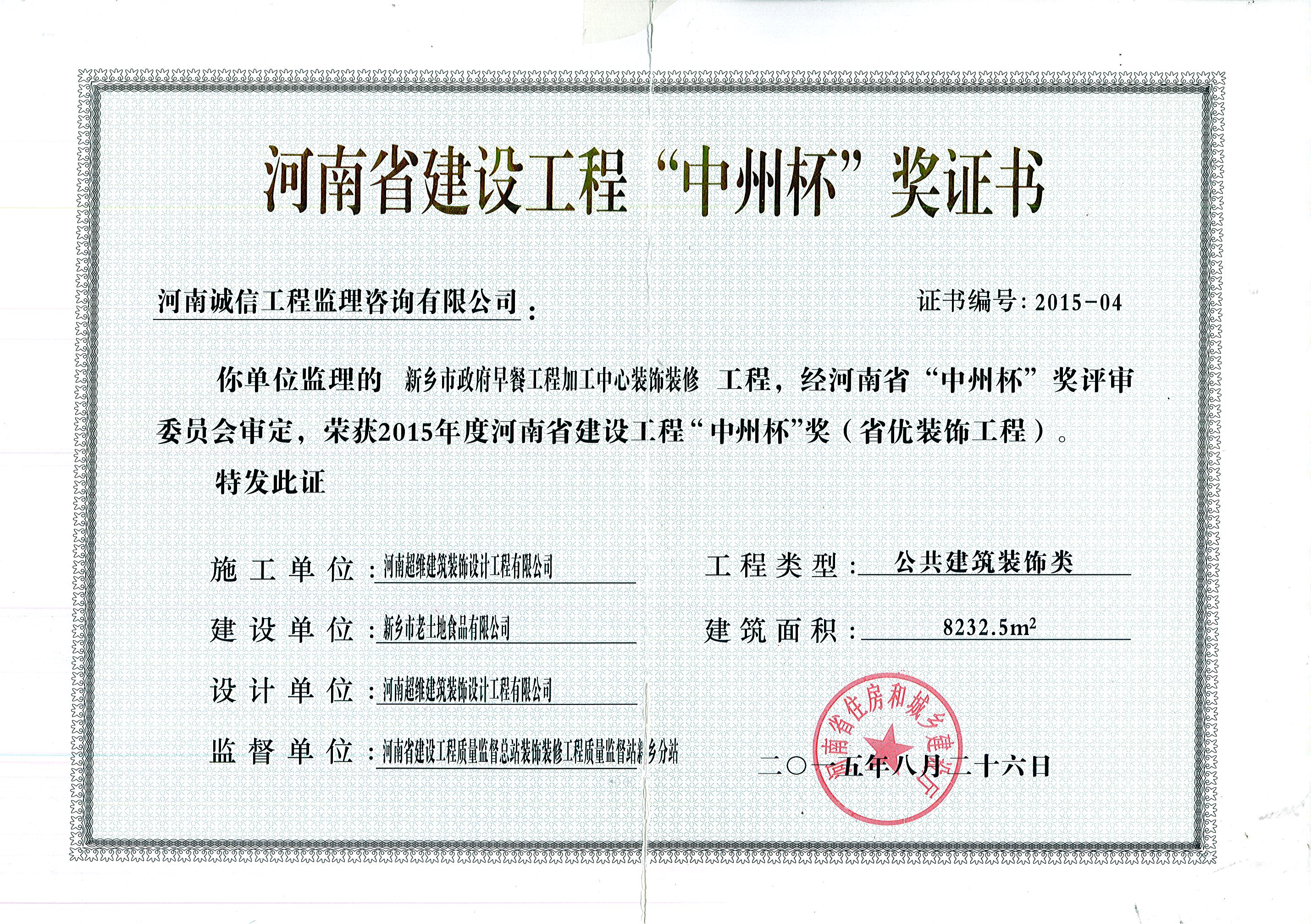 2015年新鄭市政府早餐工程加工中心裝飾裝修工程被評為河南省建設工程“中州杯獎”(省優(yōu)質裝飾工程)
