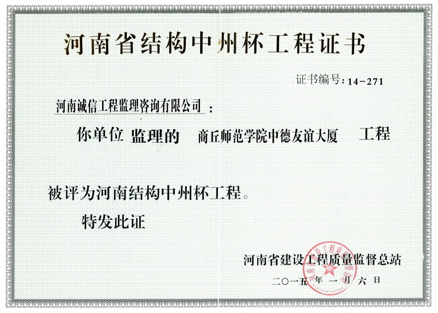 2015年商丘師范學院中德友誼大廈工程被評為“河南省結構中州杯工程”