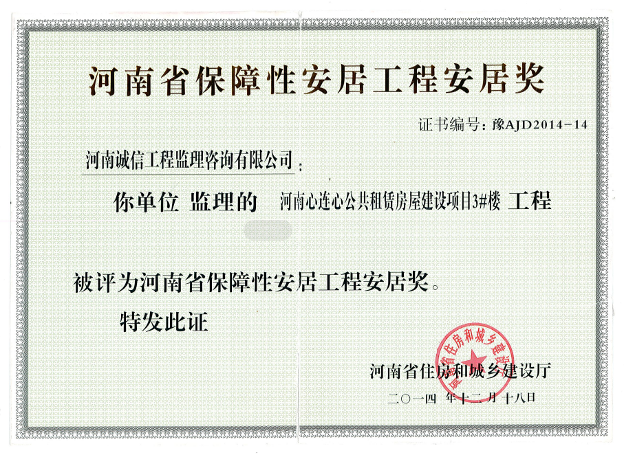 河南心連心公共租賃房屋建設項目工程被評為“河南省保障性安居工程安居獎”