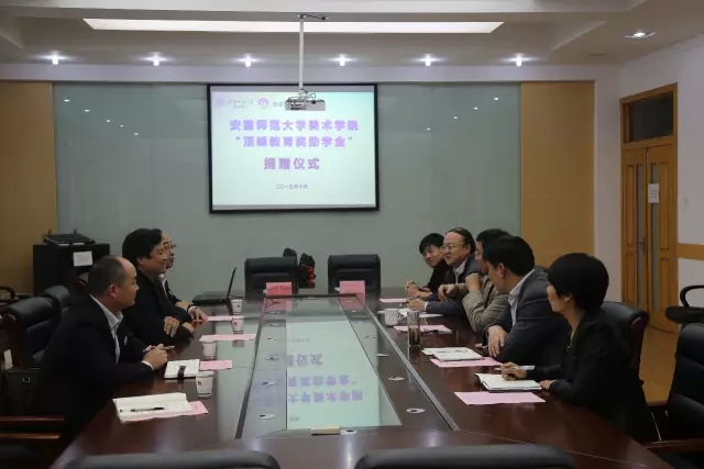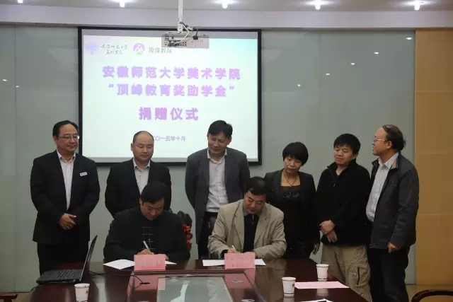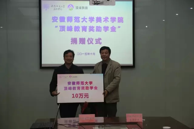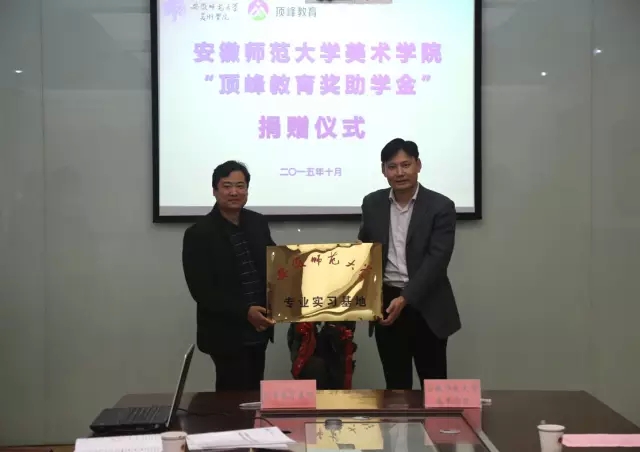 2015年10月30日,“頂峰教育獎(jiǎng)助學(xué)金”捐贈(zèng)簽約暨實(shí)習(xí)基地授牌儀式在安徽師范大學(xué)美術(shù)學(xué)院舉行。安徽頂峰教育集團(tuán)董事長(zhǎng)夏云興、總經(jīng)理龍?jiān),美術(shù)學(xué)院黨委書(shū)記王剛、院長(zhǎng)高飛,副院長(zhǎng)劉曼玉、詹學(xué)軍及各年級(jí)輔導(dǎo)員出席簽約和授牌儀式。捐贈(zèng)儀式由學(xué)院黨委副書(shū)記張韜主持。 捐贈(zèng)簽約儀式上,集團(tuán)董事長(zhǎng)夏云興先生詳細(xì)介紹了頂峰教育集團(tuán)的發(fā)展情況。他強(qiáng)調(diào),在公司發(fā)展、壯大的過(guò)程中,來(lái)自安徽師范大學(xué)的優(yōu)秀畢業(yè)生,為公司的發(fā)展做出了很大的貢獻(xiàn),目前師大畢業(yè)生已占公司教職工總?cè)藬?shù)的一半以上。懷著感恩的心情和對(duì)人才的重視,同時(shí)為了積極支持教育事業(yè)的發(fā)展,特在美術(shù)學(xué)院設(shè)立“頂峰教育獎(jiǎng)助學(xué)金”,期望雙方進(jìn)一步加強(qiáng)合作,未來(lái)能夠幫助更多的貧困學(xué)生順利地完成學(xué)業(yè),實(shí)現(xiàn)企業(yè)和學(xué)院的共同發(fā)展。 安徽師范大學(xué)美術(shù)學(xué)院院長(zhǎng)高飛對(duì)夏云興董事長(zhǎng)一行的到來(lái)表示歡迎,對(duì)安徽頂峰教育集團(tuán)在美術(shù)學(xué)院設(shè)立獎(jiǎng)助學(xué)金表示衷心感謝。高飛指出,安徽頂峰教育集團(tuán)是安徽省內(nèi)規(guī)模和影響較大的專注于藝術(shù)人才培養(yǎng)與文化創(chuàng)意產(chǎn)業(yè)投資的企業(yè),在美術(shù)學(xué)院設(shè)立獎(jiǎng)助學(xué)金充分體現(xiàn)了頂峰教育的企業(yè)社會(huì)責(zé)任和對(duì)美術(shù)學(xué)院學(xué)生的關(guān)心。同時(shí),希望以此次獎(jiǎng)助學(xué)金的簽約為契機(jī),雙方繼續(xù)加強(qiáng)在畢業(yè)生實(shí)習(xí)和就業(yè)等方面的合作。