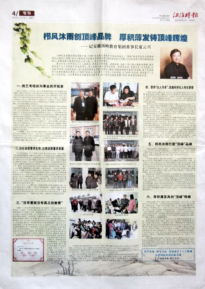 《江淮時(shí)報(bào)》整版報(bào)道頂峰教育集團(tuán)夏云興董事長
